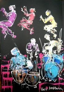 Perhaps I should have bought the figure. It was the painting that gave me that thrill of discovery. But I decided I would have more fun looking at the musicians. I look forward to having them as companions for a long time, and to seeing a lot more of Nancy Ostrovsky’s work. When I went to her studio to collect my painting–she wouldn’t let it go immediately because she wanted it to dry properly–I saw a lot more of her work. One impressive item was a copy of a poster for a Dizzy Gillespie concert, inscribed to her by Gillespie.